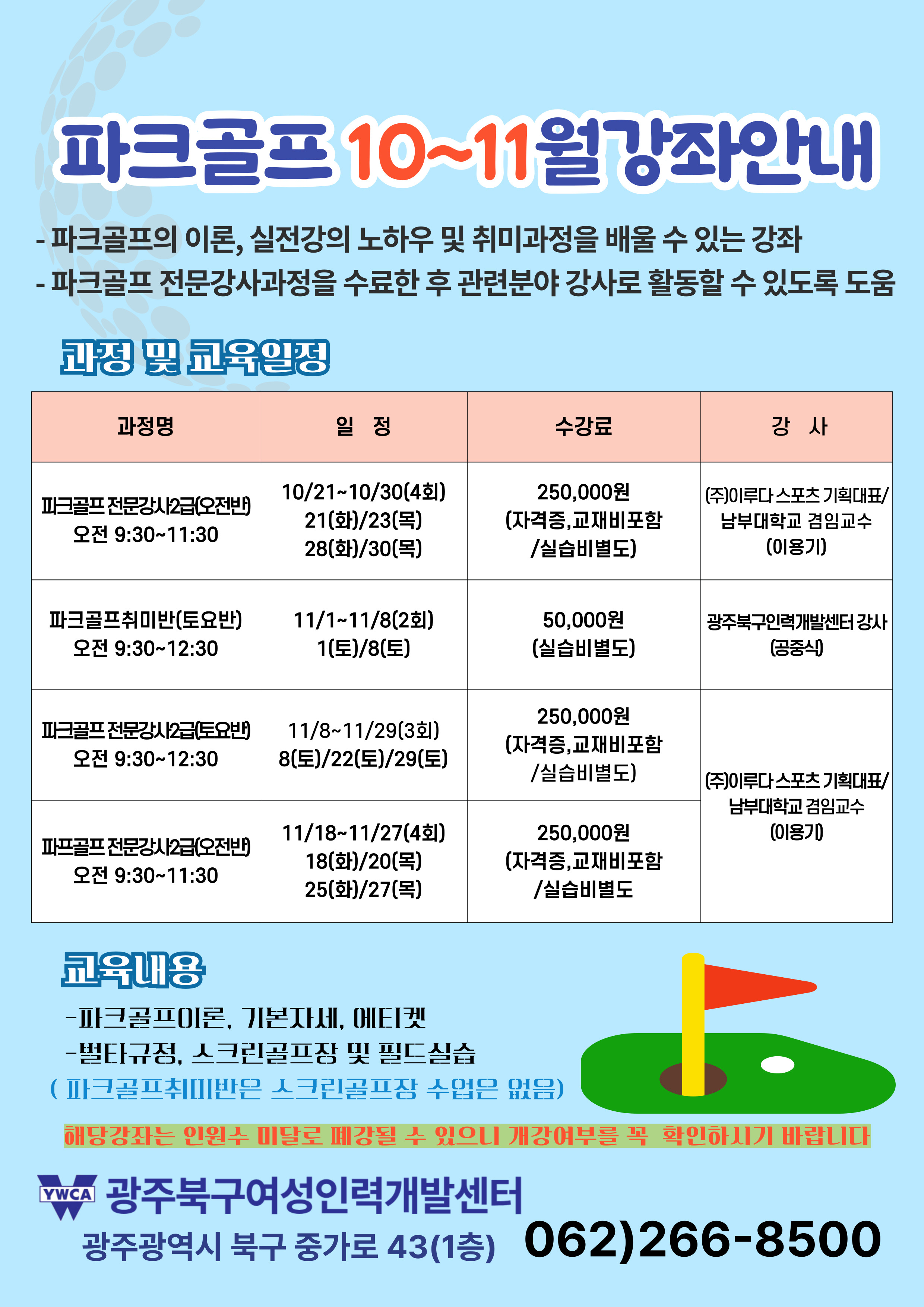 | 155 | 광주북구여성인력개발센터 파크골프 강의 일정표 /현재접수중 | 이루다스포츠기획 | 2025.10.02 | |