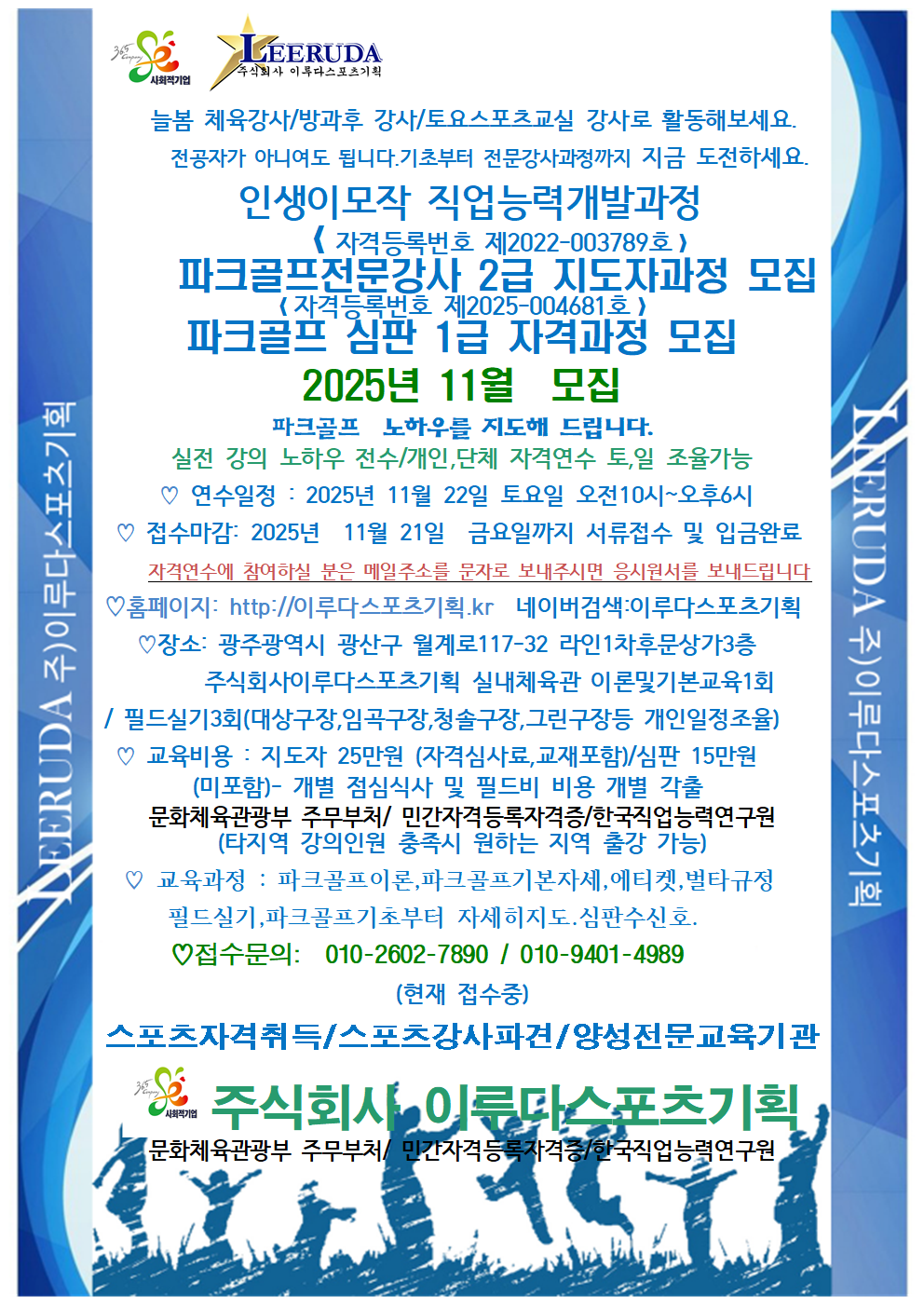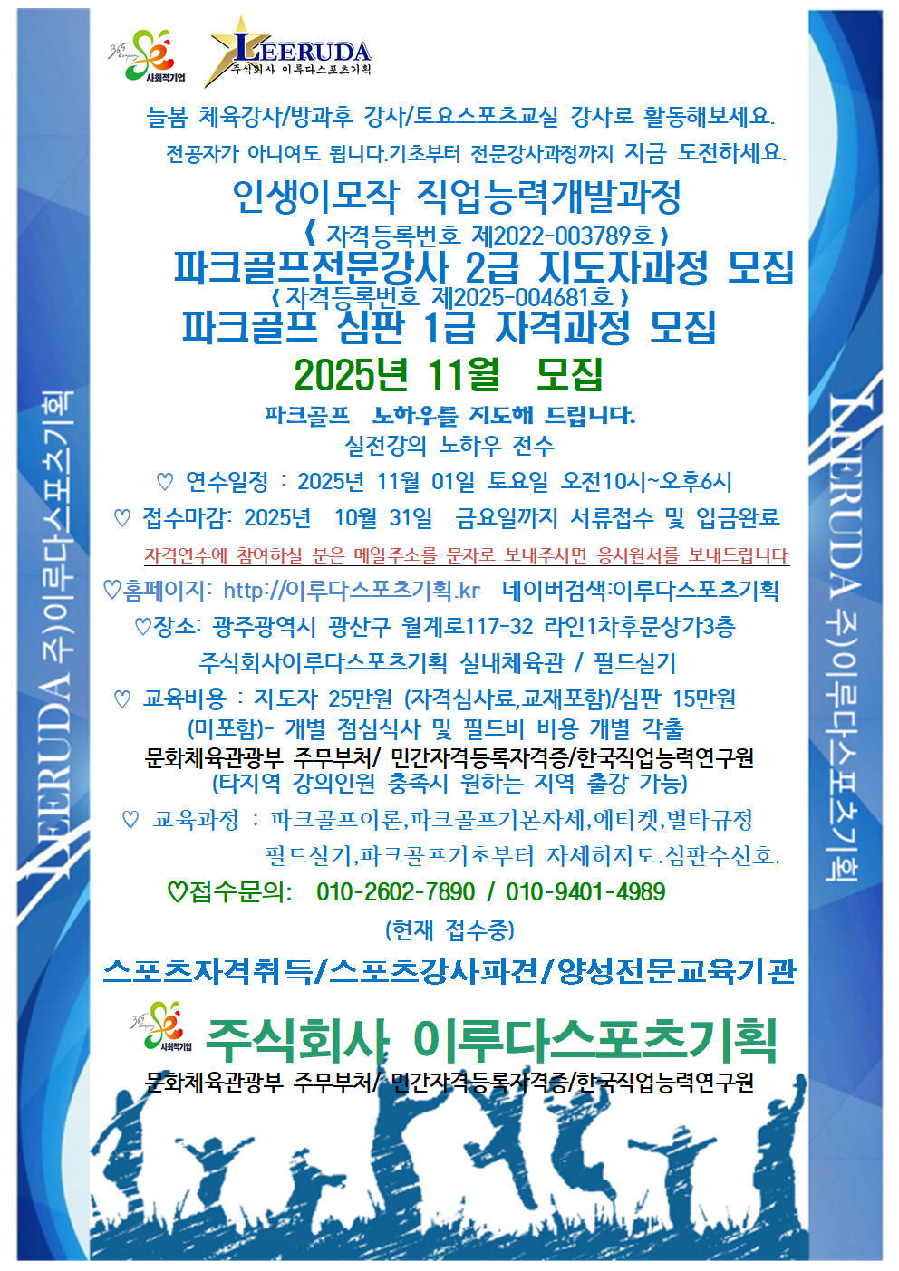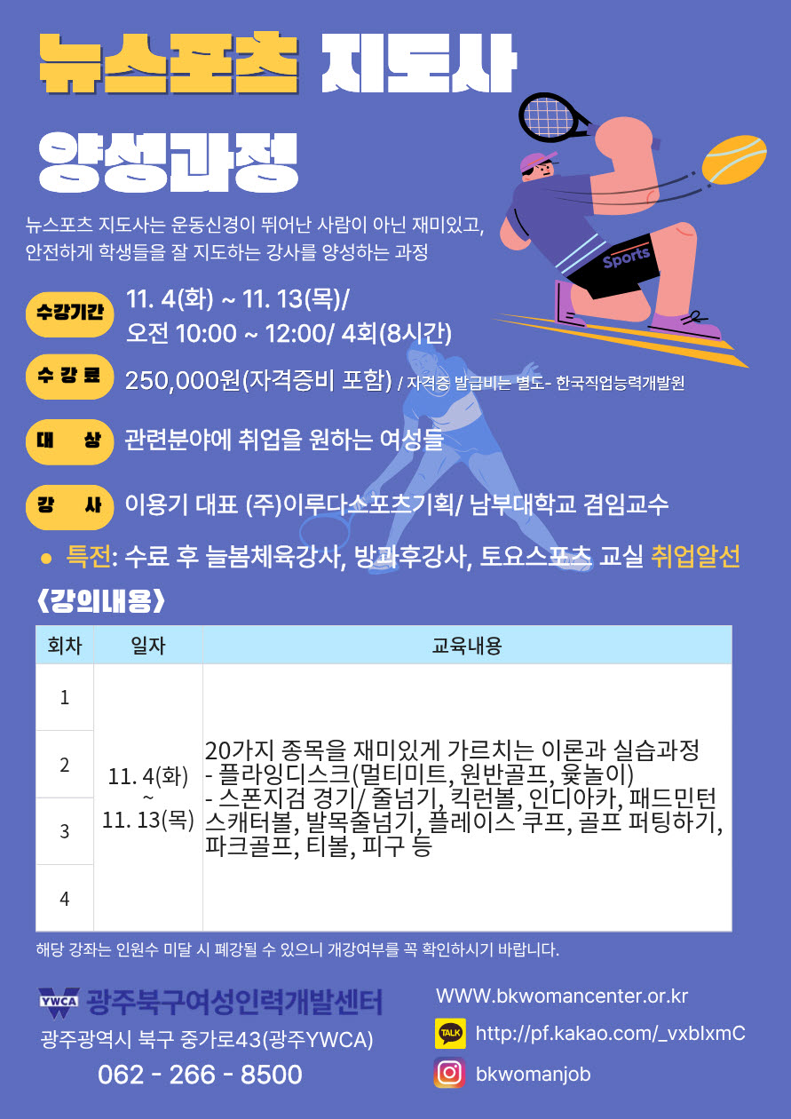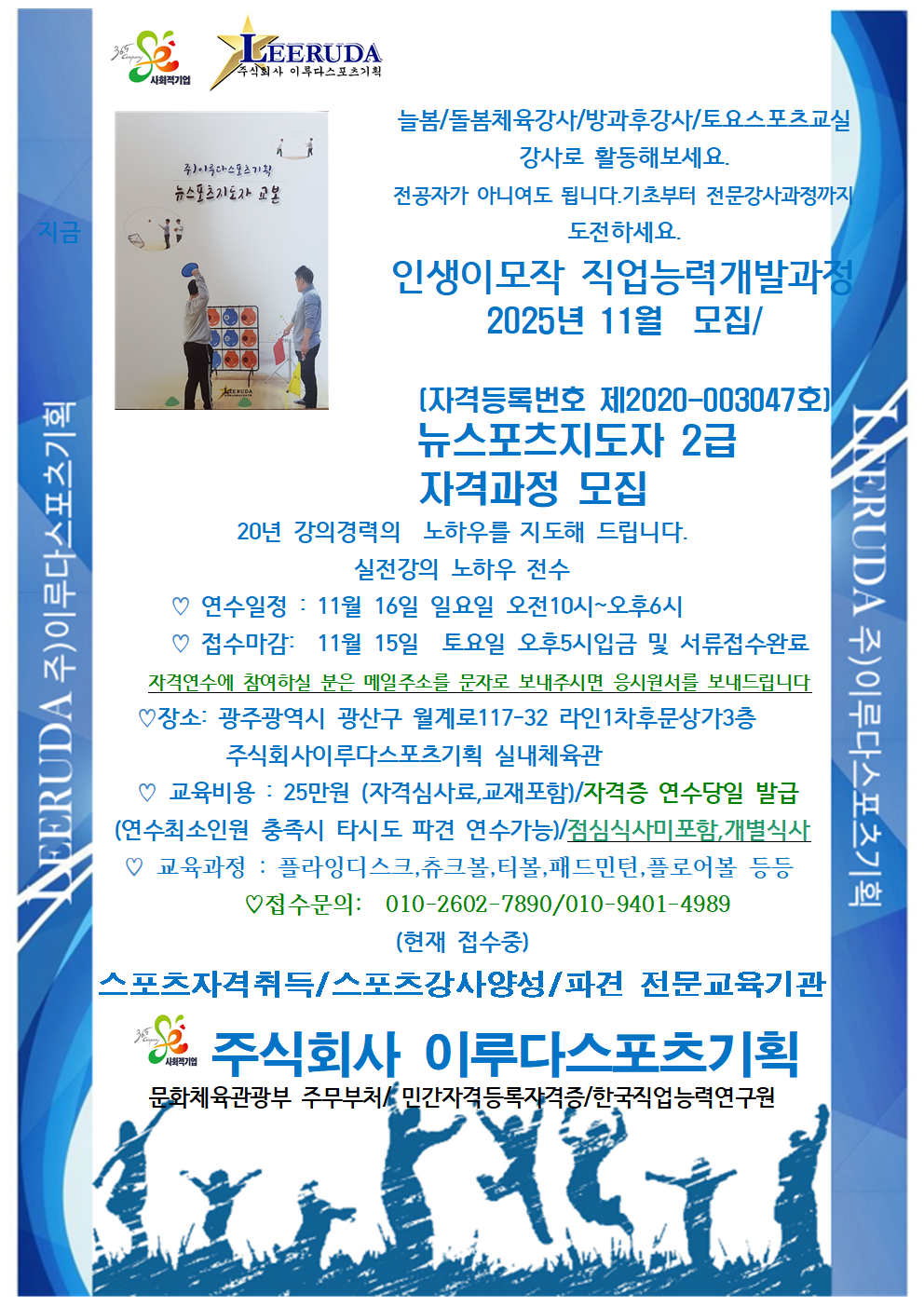 | 158 | 2025년11월모집 뉴스포츠지도자 4회차 강의/현재모집중/ 광주북구여성인력개발센터 | 이루다스포츠기획 | 2025.10.28 | |