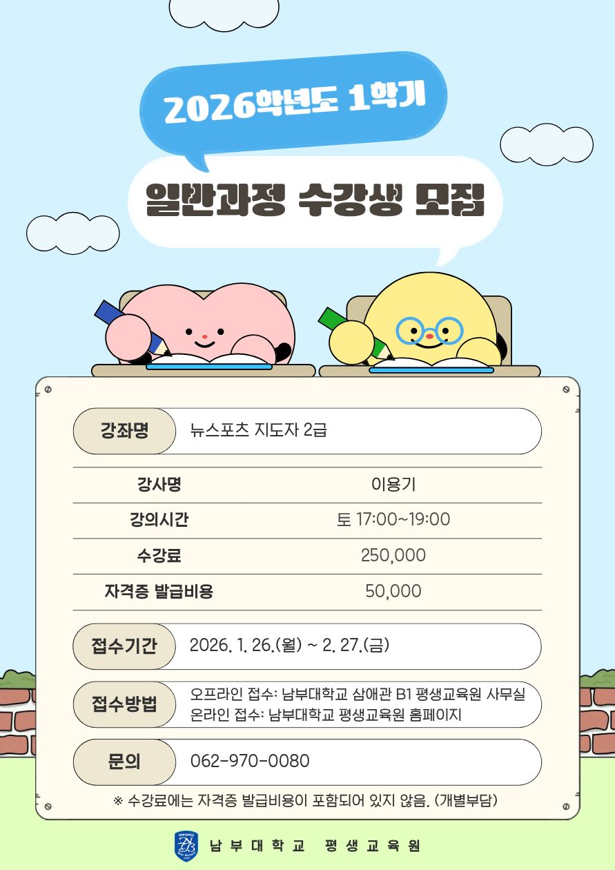 | 170 | 새글 남부대학교 평생교육원 1학기 /뉴스포츠지도자/2급자격과정 /주말 오후반 모집/현재모.. | 이루다스포츠기획 | 2026.02.06 | |