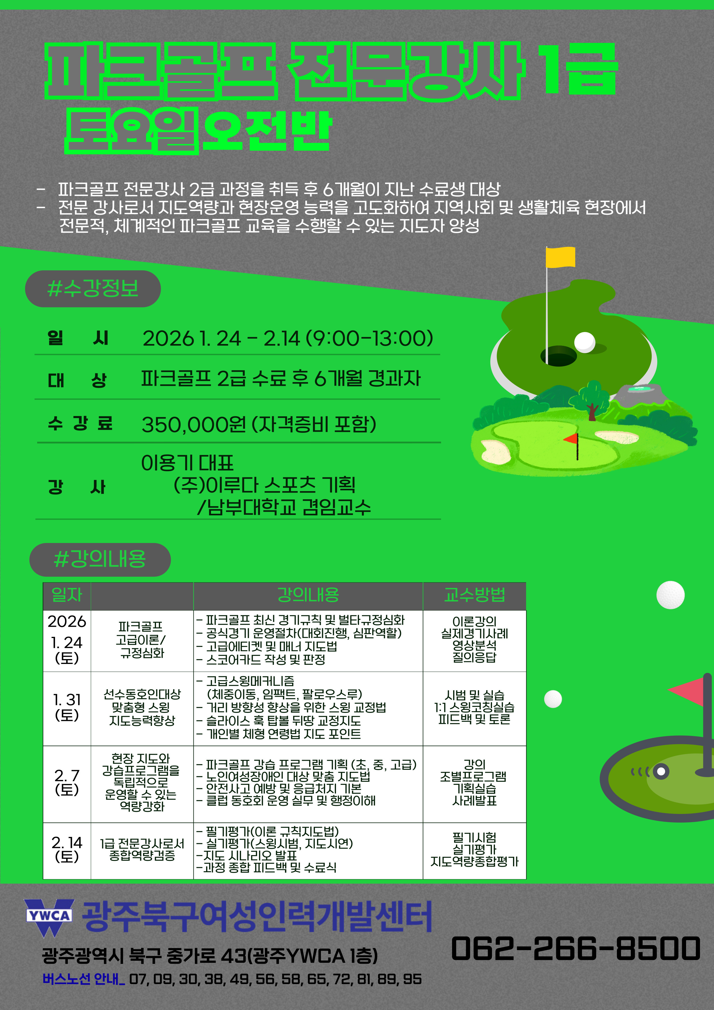 "광주북구여성인력개발센터에서 파크골프전문강사 자격과정 수강생을 모집합니다! 토요일 주말반으로 부담없이 도전해보세요!".